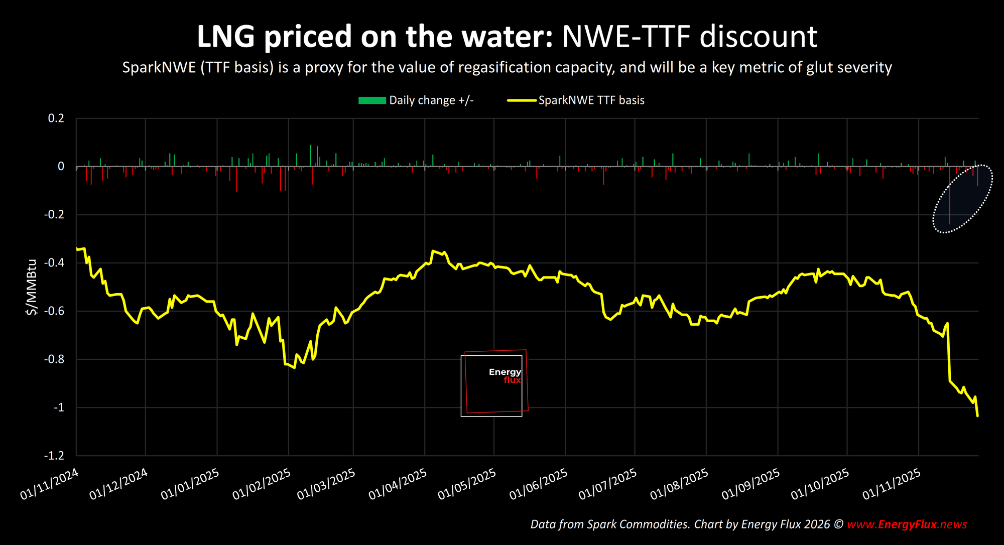 The most under-discussed signal is the SparkNWE basis, which reflects the price of LNG in north-west European waters as a discount to Dutch TTF, the benchmark price for EU gas trade.