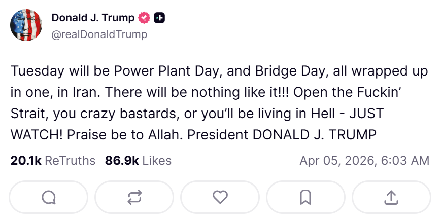 On Monday 6 April, he doubled down: “every power plant in Iran will be out of business, burning, exploding, and never to be used again” if Iran does not reopen Hormuz by midnight tonight.