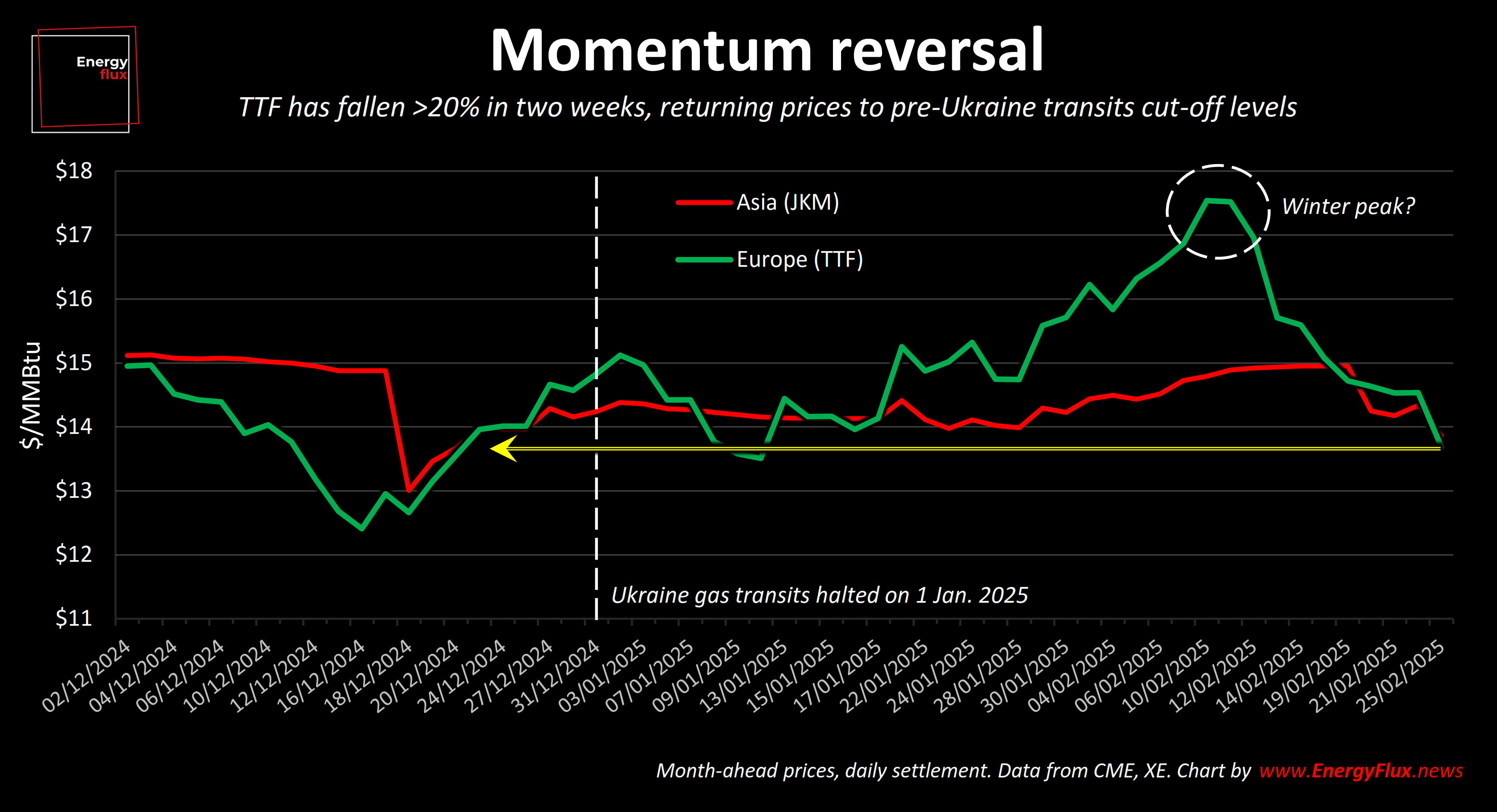 The front-month contract (Mar-25) lost 12% this week alone, dipping to €41/MWh ($13/MMBtu) on Tuesday. These are prices not seen since mid-December, before the loss of Ukraine gas transits.