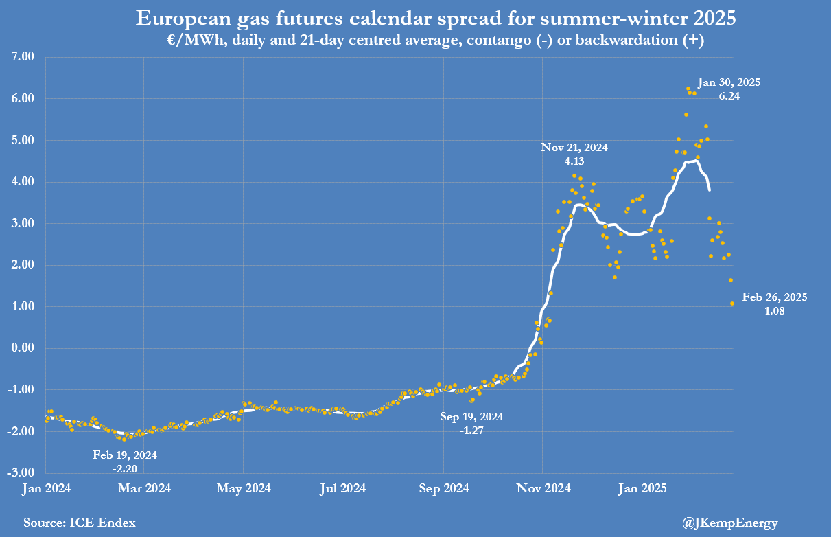 The summer 25 contract is now trading at less than €1 above winter 25-26, having peaked above €6 just a few short weeks ago. For next year, the summer 2026 contract is back below the following winter (i.e. a return to seasonal ‘normal’).