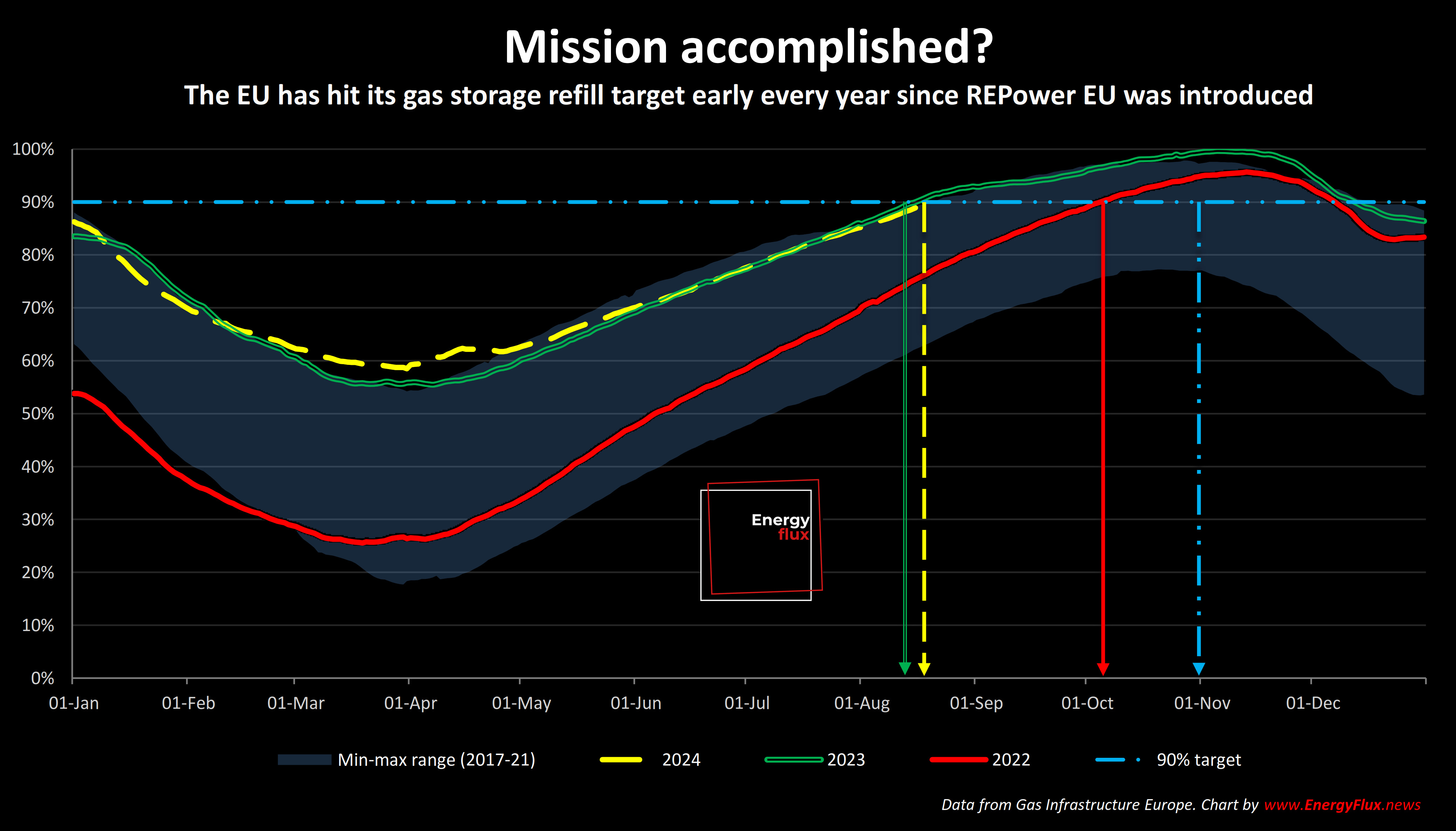 The European Union has once again achieved its gas restocking target early. At an aggregate level, EU underground gas storage facilities reached 90% full this week, more than two months ahead of the 1 November deadline.