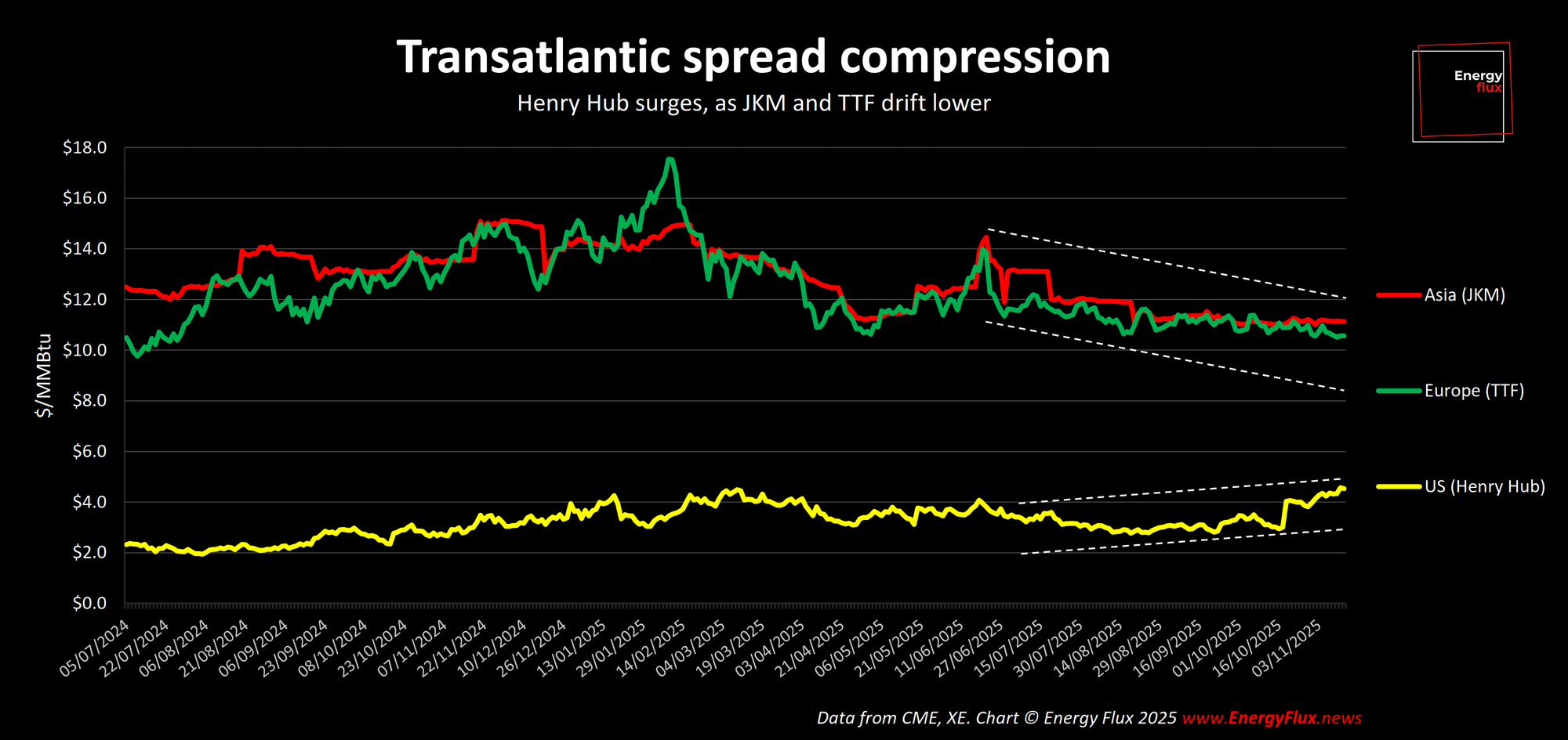 Meanwhile in America, after years of shale abundance and low prices, the domestic gas market is tightening on LNG plants’ insatiable thirst for feedgas. Henry Hub has spiked more than 50% since mid-October, driven by colder weather and record exports.