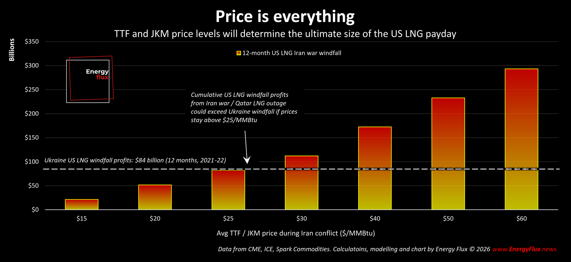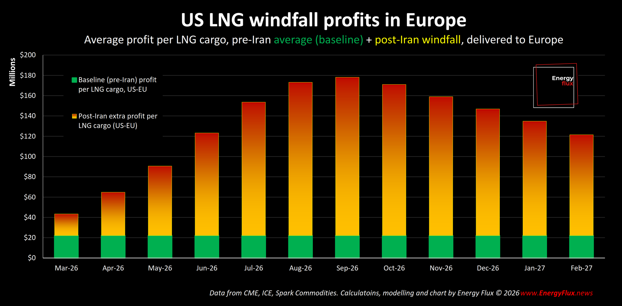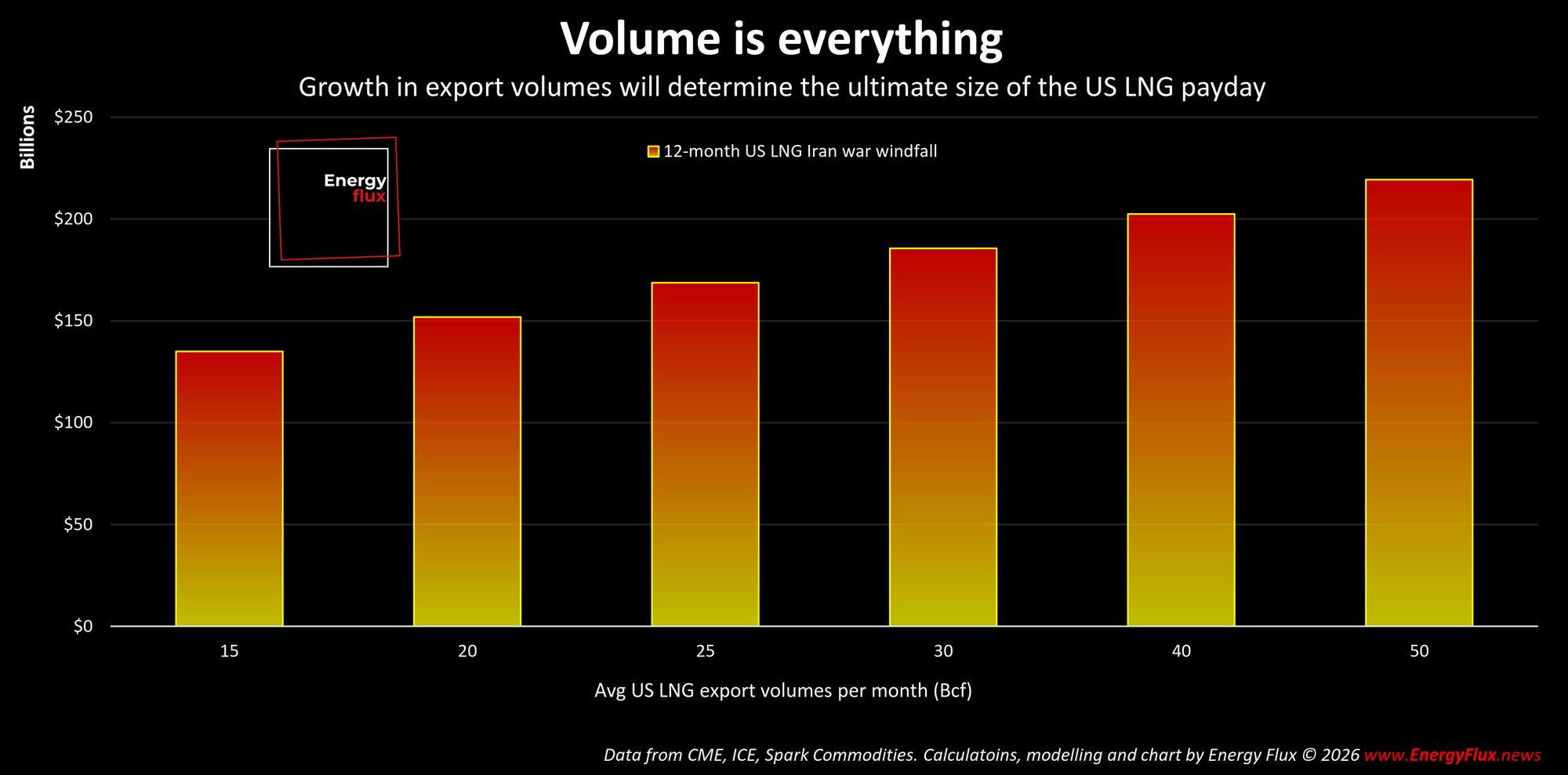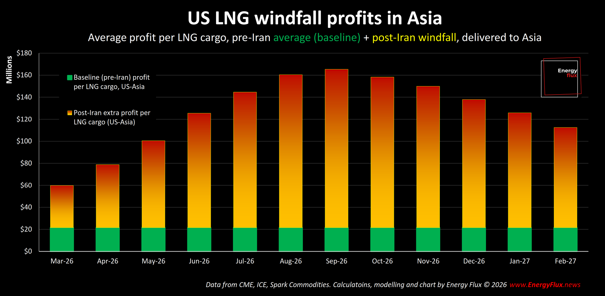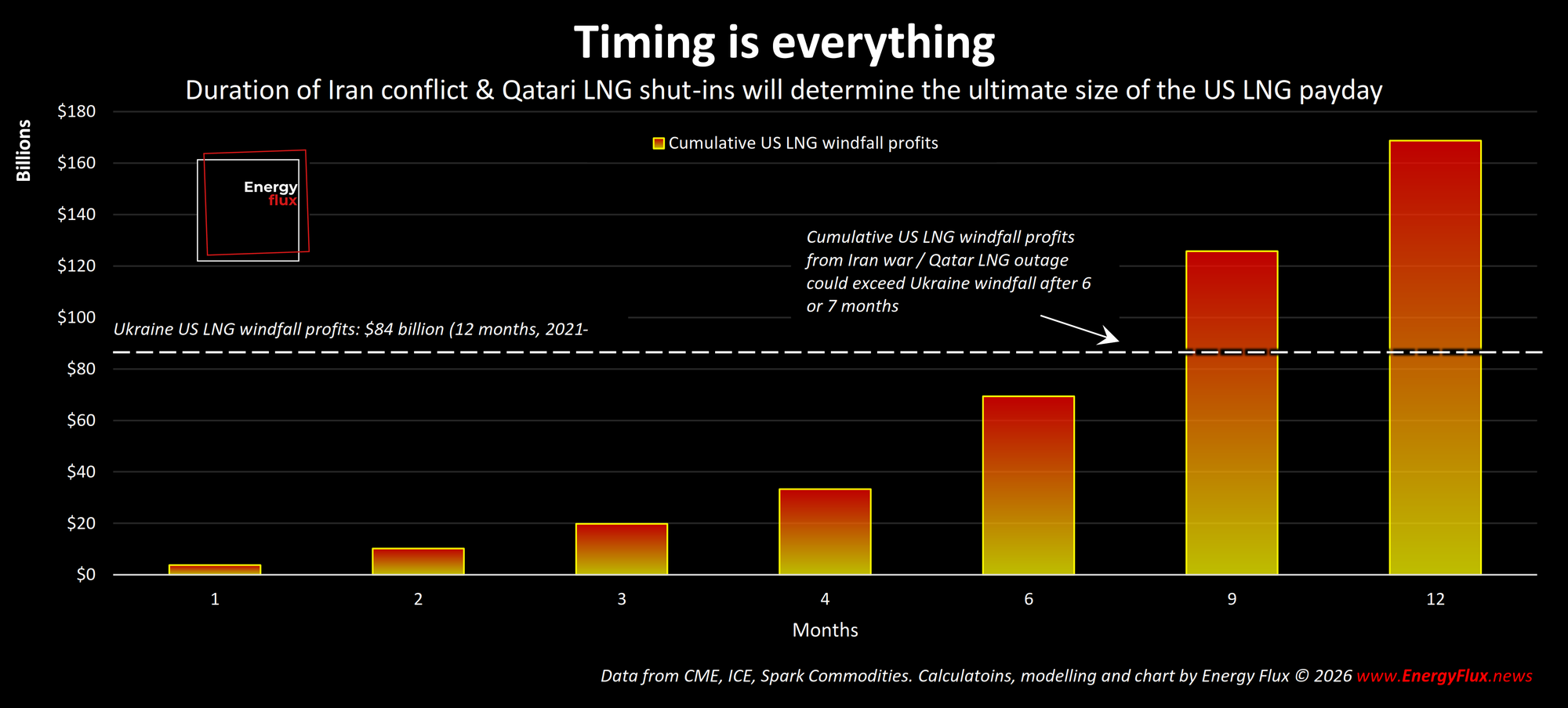Cumulatively, US LNG war profits rise sharply the longer the Middle East conflict drags on, as prices spiral on physical tightening of global balances.