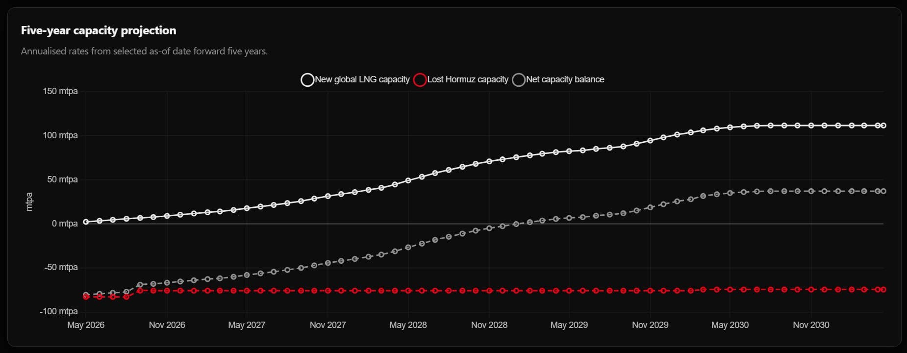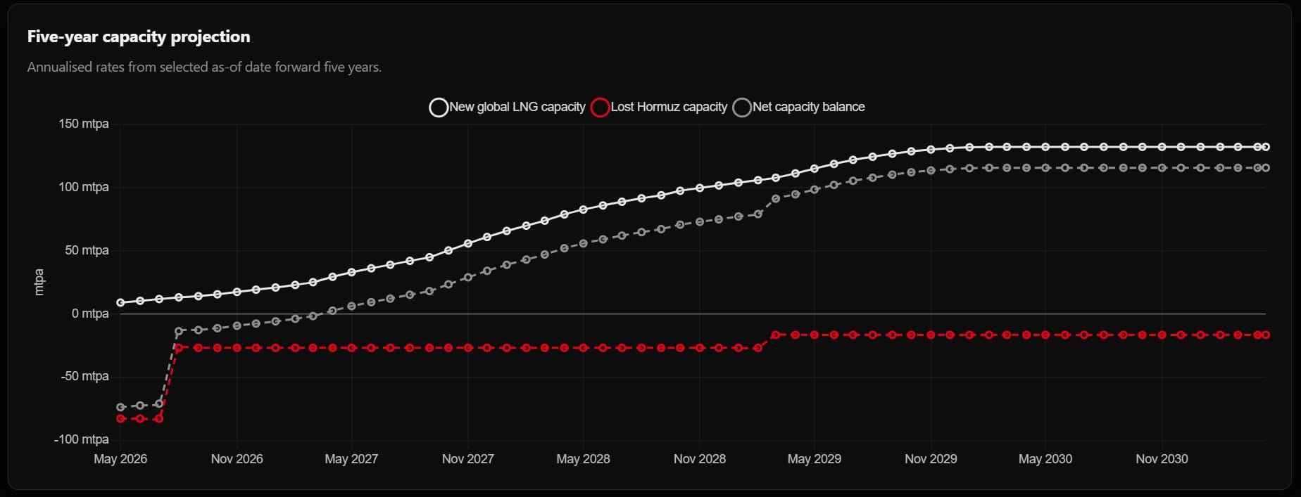 The model indicates that lost export capacity linked to the closure is not replaced until January 2029. That is the point at which new non-Hormuz LNG capacity additions finally match the annualised capacity removed from the system.